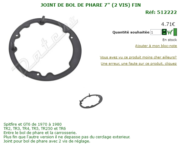 | @Philippe j'utilise la Réf. 13H565 chez Betatruc (comme joint bas photo de droite), et c'est ok avec phares Lucas sur ma MK3 de 68., les 2 tétons sont pour les vis de réglages et coïncident avec trous carrosserie. Spitamicalement JMarie |