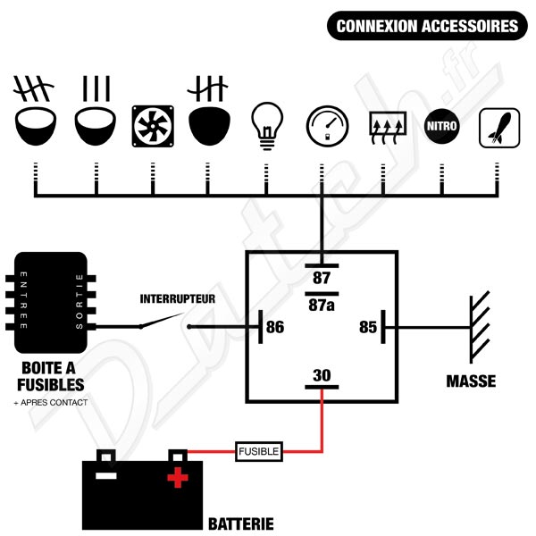 | Bonjour Dean, Oui, pas sécurisant du tout l'état de ton faisceau: fils soudés à nu & fiches isolées avec du scotch.. Je te conseille de vérifier toutes les connexions du faisceau et de revoir l'isolation. Ton interrupteur doit commander l'action du relais. Les fiches de ton relais sont repérées par des n°. Pour tester, tu relies la fiche n°86 au + de la batterie. En mettant la fiche n°85 en contact avec le -- batterie le relais doit claquer. Tu peux tester la sortie du relais en répétant la même opération mais en ajoutant un accessoire (ton ventilo ou une simple ampoule 12V): Branche le + batterie sur la fiche n°30 et le premier fil de ton ampoule sur la fiche n°87 et le second directement sur le -- batterie. Si l'ampoule s'allume quand tu mets la fiche n°85 sur la borne -- batterie alors le relais est ok. Ensuite la sonde de déclenchement sur le circuit de refroidissement est peut être défectueuse: déjà bien désoxyder ses fiches puis la déposer et tester sa température de déclenchement avec un ohmmètre après l'avoir suspendue dans une casserole d'eau chaude (ne pas la laisser au fond!). cdlt :) |
