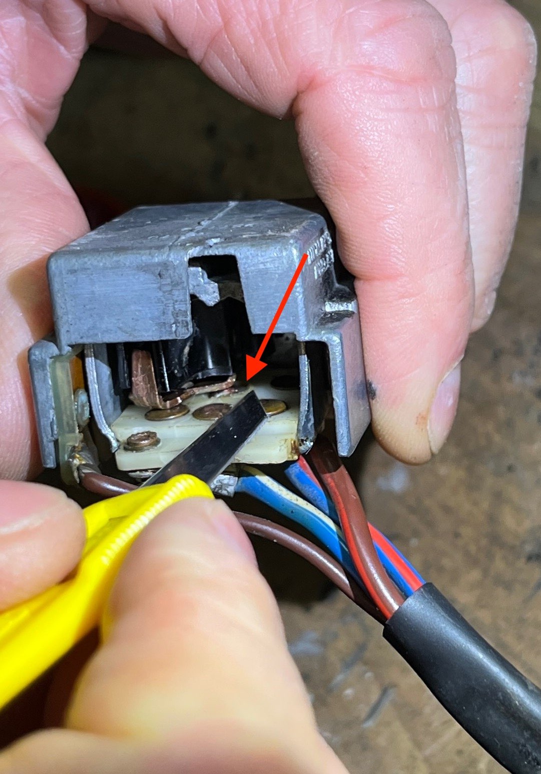 Brun/rouge le fil entre interrupteur et commodo volant Rouge/blanc illumination tableau de bord, que en deuxième position Ca veut dire brun/rouge est allimenté dans les deux positions Commodo avec trois positions: veilleuses, codes, plein phares |