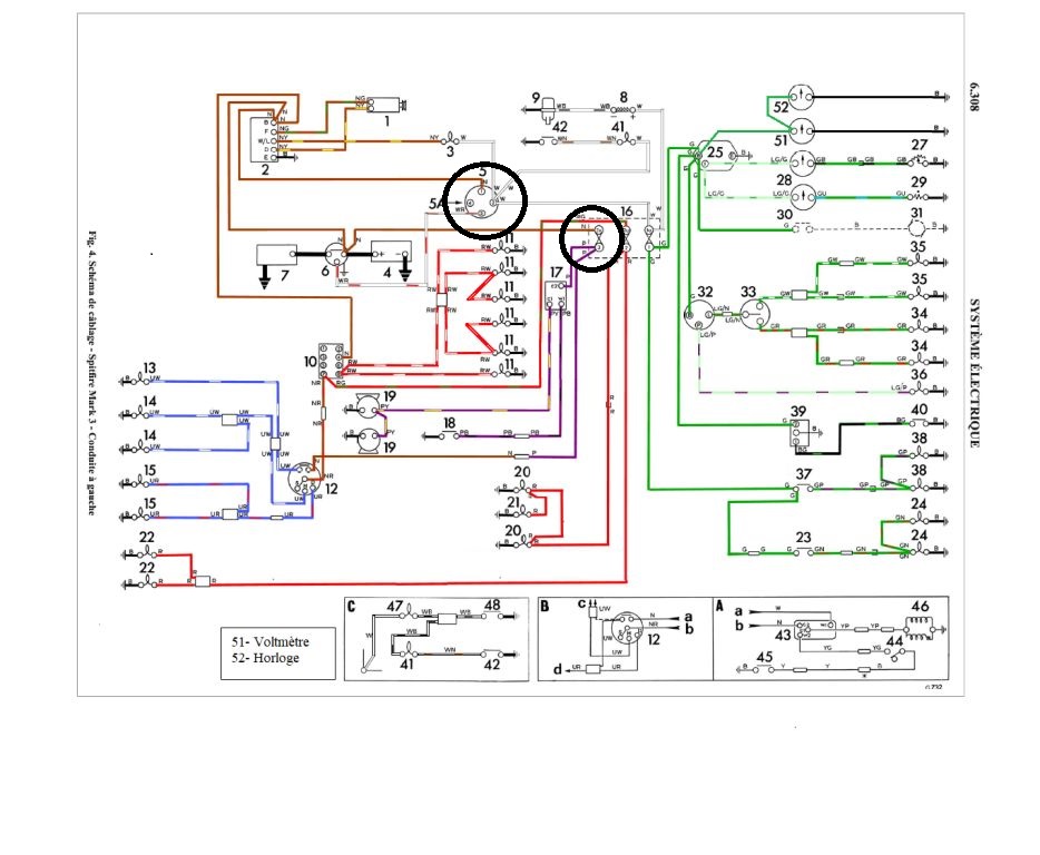 Sur le schéma, juste au-dessus du repère N°20, le violet qui vient du fusible est relié à un marron avec un connecteur, et va au comodo pour l'appel de phare. En fait le fusible N°1 protège les avertisseurs et l'appel de phare, mais les codes et les phares ne sont pas protégés, les veilleuses le sont : fusible N°2 fil rouge.