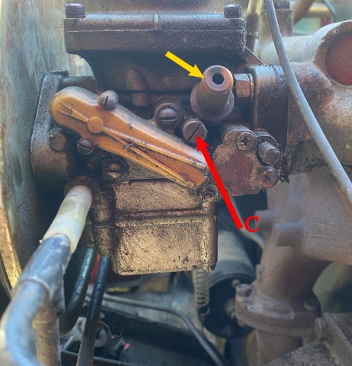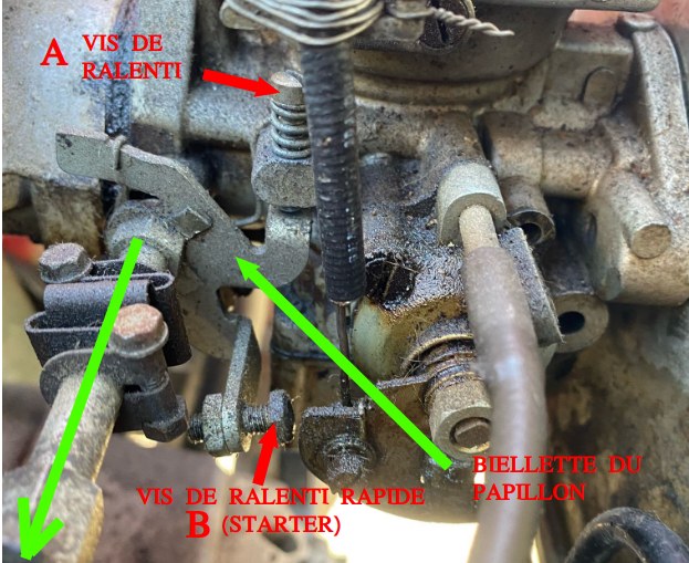 (pour info : en A = la vis de ralenti normal (sans starter), il y en a une par carbu. régler les 2 de la même valeur).