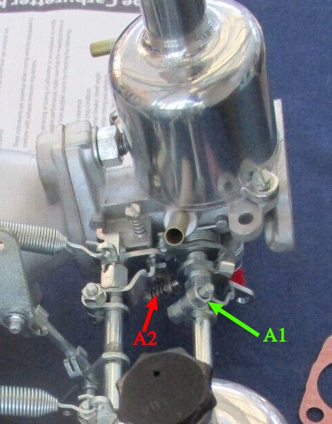 Dans cette position, régler la vis de came (A2 sur schéma) de la même valeur sur les 2 carbus pour obtenir un régime stable de 1100 à 1300 tours.