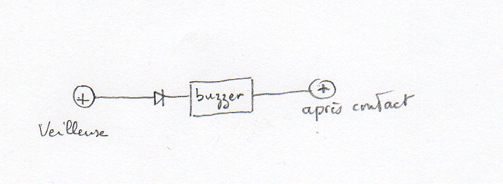 | Bah oui, simple et utile. Pour la diode, n'importe quel modèle basique convient, 1N4004 par exemple. Si le buzzer est polarisé, fil rouge côté diode. |