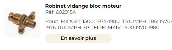 Sur le bloc moteur que je remonte pour ma Spitfire MK3, il y avait un robinet comme sur la photo. Mais il était mort, il a cassé au démontage. J'en ai commandé un autre. Mais je n'arrive pas à le visser dans le trou... Je pense que le taraudage doit être abimé. Sur l'autre bloc moteur que j'ai, il y a une vis avec un joint. J'ai essayé de le mettre en place, mais il ne va pas, il force trop, et le filetage de la vis a commencé à dégager. Est-ce un taraudage conique ? Je voudrais acheter un taraud pour tenter de refaire l'amorce du taraudage, mais je ne connais pas le diamètre et le pas de ce trou. Quelqu'un aurait l'information, svp ?