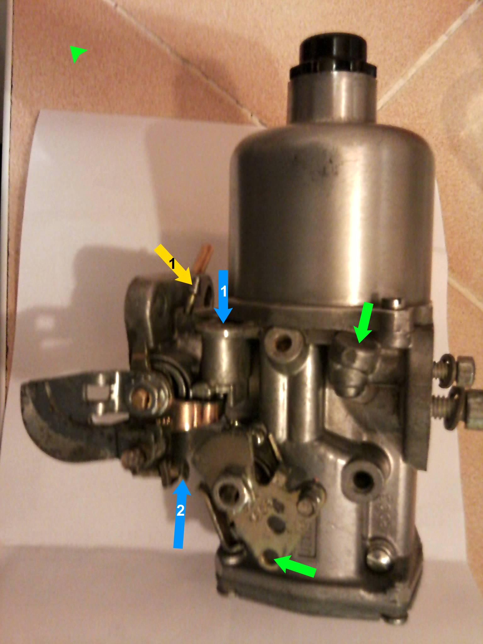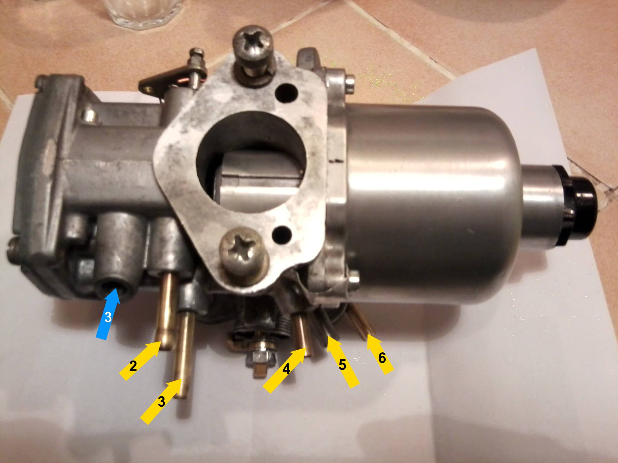 Un "détail" particulier chez les HIF (le "I" est pour cuve -à essence- intégrée, à la différence du "S" des HS qui est pour cuve séparée : la richesse fonctionne à l'envers de la plupart des carbus, c'est à dire que plus vous serrez la vis, plus le gicleur descendra, donc vous enrichirez le mélange.