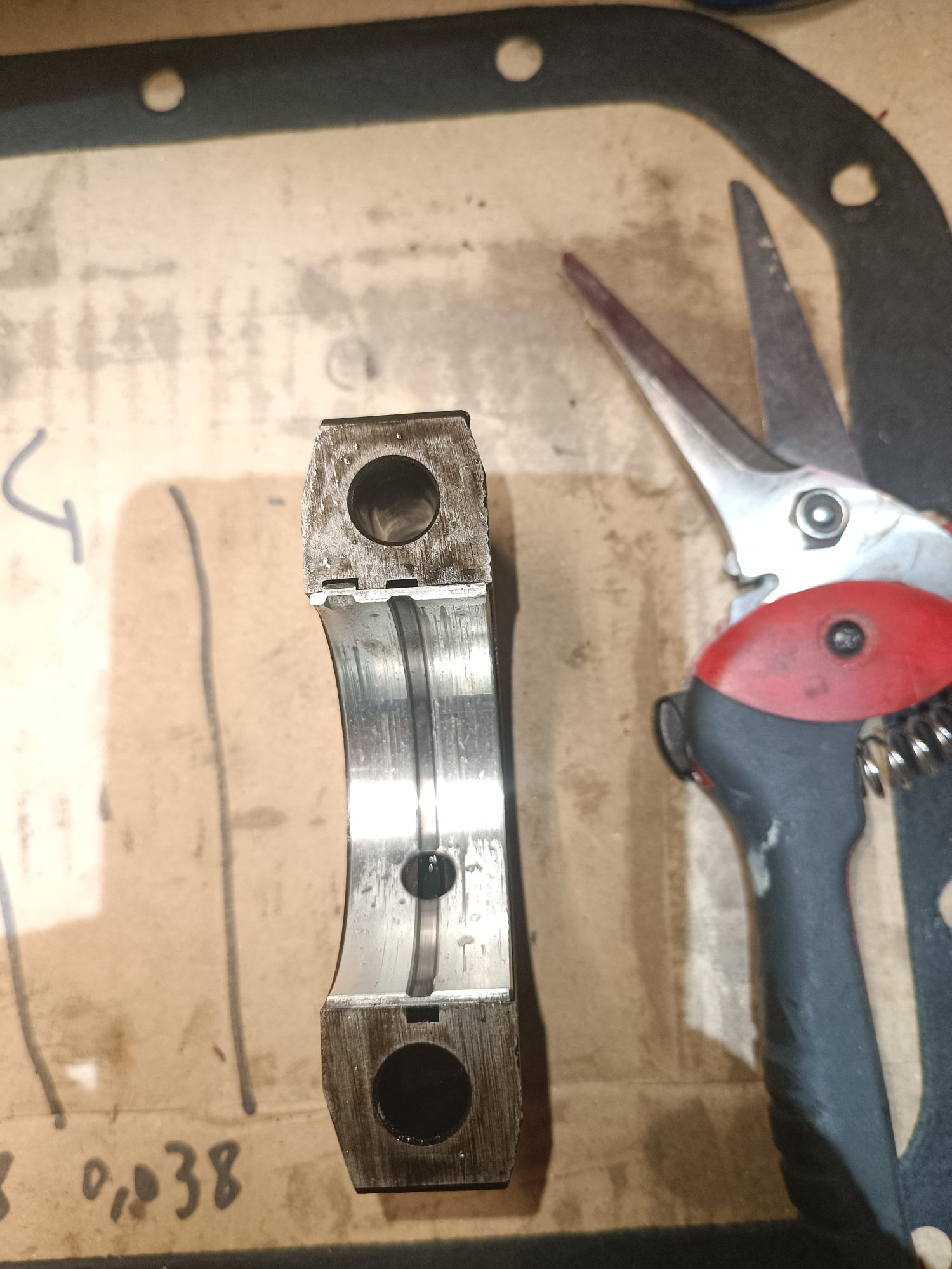 Merci Tommy. Déposer le chapeau du palier central : tu parles bien de démonter le palier central du vilebrequin ? Qu'est ce que je peux vérifier ? L'état du coussinet ? Aujourd'hui, j'ai démonté un pied de bielle pour vérifier l'usure du coussinet (voir photo). C'est un coussinet 030, qui a été monté neuf. Il y avait déjà des coussinets 030 en place auparavant. J'ai commandé du plastigauge pour vérifier les jeux. Quel est le jeu admissible pour les coussinets de bielle ? J'ai à nouveau démonté la soupape de pression d'huile pour nettoyer. Je suis surpris qu'au remontage, on ne sente pas une pression s'exercer quand la soupape appuie sur son plan, à la fin du vissage. On ne devrait pas sentir un peu la compression du ressort ?