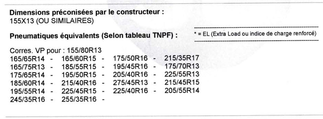 | Bonjour, j’ai pris chez Feu Vert des Dunlop SP StreetResponse 155/80 R13 79T : https://www.feuvert.fr/trouver-un-pneu/dunlop-pneu-dunlop-155-80r13-79t-street-response-2/p252753.html La monte d’origine était du Dunlop SP68 ou du GoodYear G800, en 155/80 SR13. Pour la charge et la vitesse ça ne sert à rien de s’inquiéter outre mesure. Une spit pèse 750 kg, mettons 1,1 tonne tous pleins faits avec deux costauds de 120 kg et leurs 50 kg de bagages (s’ils arrivent à les faire rentrer), donc 275 kg/pneu donc les indices au dessus de 64 (280 kg) sont adaptés. La vitesse max neuve est de 163 km/h, donc les indices à partir de R (170 km/h) sont adaptés. |