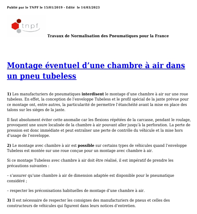 | La version en ligne du texte de jpc 8430 : https://www.tnpf.fr/vehicules_legers/montage-eventuel-dune-chambre-a-aire-dans-un-pneu-tubeless/ On notera sur le même site un article introduisant un tableau d’équivalence des dimensions de pneus pour automobiles : https://www.tnpf.fr/le-tableau-dequivalence-dimensionnelle-applicable-aux-vehicules-legers/ Le tableau en pdf : https://www.tnpf.fr/wp-content/uploads/2021/10/CoDim-T-2021.pdf Merci JPC !! |