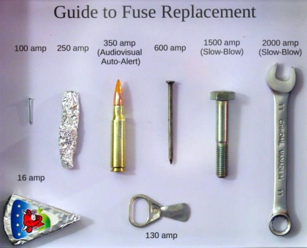 Avec de tel fusibles un gars a remporté le Darwin Awards (https://fr.m.wikipedia.org/wiki/Darwin_Awards) : https://www.mort-stupide.fr/balle-ne-remplace-fusible/