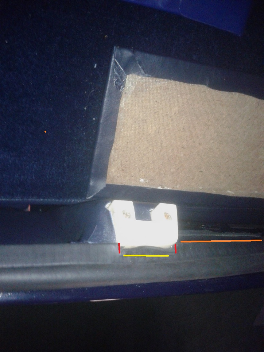 ![]() j'ai amélioré l'horizontalité en abaissant la goulotte (ligne orange), j'ai donc dû retirer le panneau de garniture que je devrais retailler car il empêchait la goulotte de descendre. Ensuite le hayon avait toujours du mal à fermer et était légèrement relevé au centre, après inspection je me suis rendu compte que le joint appuyait sur la retenue en téflon blanc. J'ai donc incisé de chaque côté le joint de coffre (en rouge) et plié sur la longueur (en jaune que j'aurais pu couper au lieu de plier, j'y réfléchirai) ce qui m'a permis de régler la fermeture et je n'ai plus de déformation du hayon qui ferme correctement |