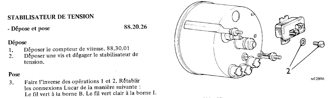 Bonsoir , je ne comprends pas tout sur le branchement du stabilisateur de tension de ma Spit ( modèle MK3/MK2) . La photo représente un stabilisateur de MK2 avec borne I ( femelle) et borne B (mâle) ...comme sur le modèle de "Raph 69" .Sur ma Spit , les fils verts (foncés) sont branchés sur I , et les verts clairs sur B .Sur le schéma MK2 ( les 2 lettres I et B ne sont pas notées ): vert foncé (G) est le + venant du fusible et vert clair (L/G) vers les 2 manos T° et réservoir essence .J'en déduis que la borne I est l'entrée ou alimentation + et la borne B vers les manos . Et là , surprise , sur le schéma MK3 (les lettres I et B apparaissent !) , le branchement est inversé .J'ai démonté le stabilisateur ( que je pense HS ?) et regardé le bilame : branchement n°1 (+ sur B ) = rien (12 V entrée et sortie) puis branchement n°2 (+ sur I ) le bilame s'ouvre , mais ...quid de la régulation de tension ?
