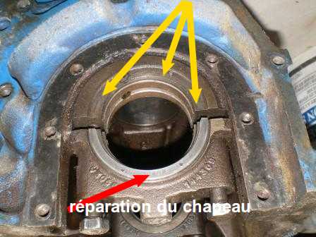 Je suppose que tu es dans la situation suivante: le vilo a bouffé la bordure du chapeau AR et le maintien des cales n'est plus assuré. Si les gorges de maintien des cales sur le bloc (flèches jaunes) n'ont rien, possible de réusiner/dresser la face du chapeau puis de refixer dessus une demi-lune en guise d'arrêtoir avec 3 vis noyées à tête fraisée (flèche rouge). Le chapeau en place n'est pas directement interchangeable avec celui d'un autre bloc, même s'il s'agit du même type de moteur. En production les chapeaux bruts sont serrés au couple avant usinage de la ligne d'arbre donc impossible de retrouver un alignement parfait ou un alésage parfaitement cylindrique avec une pièce venant d'un autre bloc, à moins d'effectuer un réalésage en ligne ce qui implique de "raboter" les 3 chapeaux ($$$$..) La largeur initiale du chapeau peut être déterminée en prenant la cote à la base de chacun des 2 "pieds", c'est la même surface. En principe le vilo usine un sillon circulaire mais laisse intact les extrémités du chapeau. cdlt ;) |