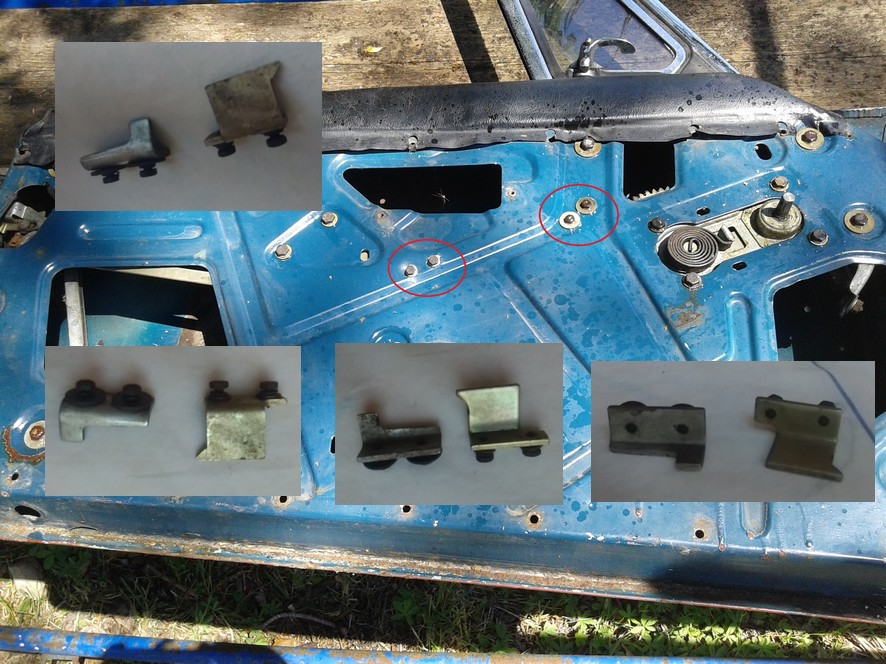 | deux arrêtoirs par portes le deuxième a une forme légèrement différente plus biseauté et se fixe plus haut en oblique vers le déflecteur pour limité la remontée de la vitre (toujours de mémoire) Plus d'investigation une fois rendu 'at home' |