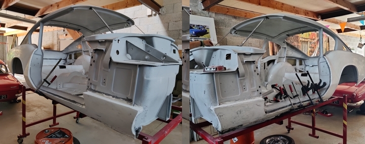 ![]() Nous avançons sur la caisse avec la mise en place des ailes arrières et bas de caisse en fibre. Les bas de caisse en tôle qui ont servi à fabriquer les moules étaient en piteux état et ont été mastiqués juste pour permettre la confection des moules en fibre ce qui a entrainé quelques défauts que nous devons rattraper une fois posés sur la caisse. Un peu de boulot de finition mais rien de bien grave. |