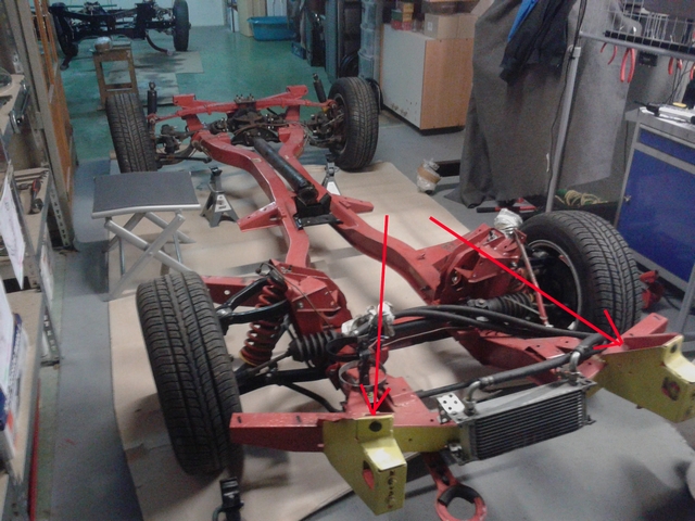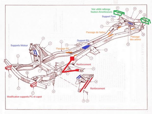 ![]() Afin s’assurer le passage aisé des arbres de transmission le châssis devra être retravaillé à ces endroits. |