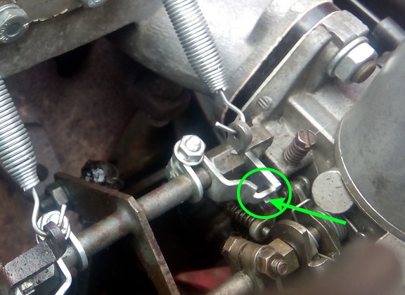 0,40 gras pour l'écartement des vis c'est bien, en tenant compte de l'usure à venir dûe au rodage du patin. Ne cherche pas à régler les 2 gicleurs absolument à la même hauteur. Il faut tester la richesse individuellement à l'aide de la goupille (présente sous chaque carbu). Concernant ton décalage de synchro: Si c'est ok au ralenti et pas en accélération c'est peut-être causé par un mauvais positionnement angulaire des pattes d'entrainement agissant à l'intérieur des fourches sur la tringlerie entre les carbus.(photo) Quand tu tires sur le cable d'accélérateur à la main au niveau du moteur : Sur les 2 carbus la patte doit venir en contact contre la base de sa fourche respective exactement en même temps. cdlt ;) |
