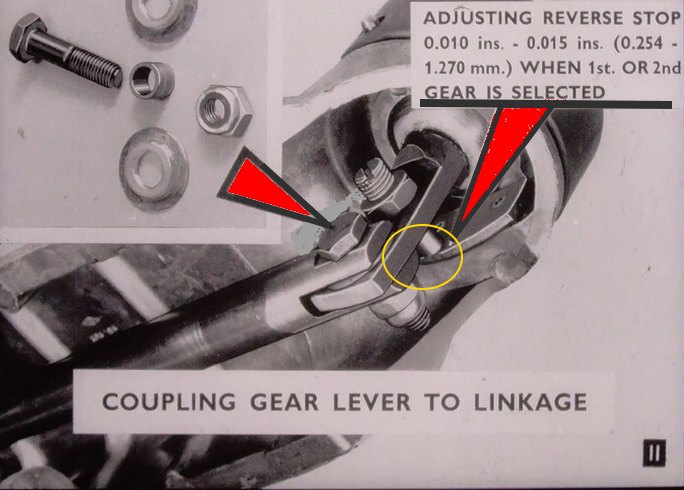 ensuite vérifier l'état et la position correcte des éléments du levier de vitesses/tringlerie (orientation correcte boulon flèche rouge + réglage de la butée)