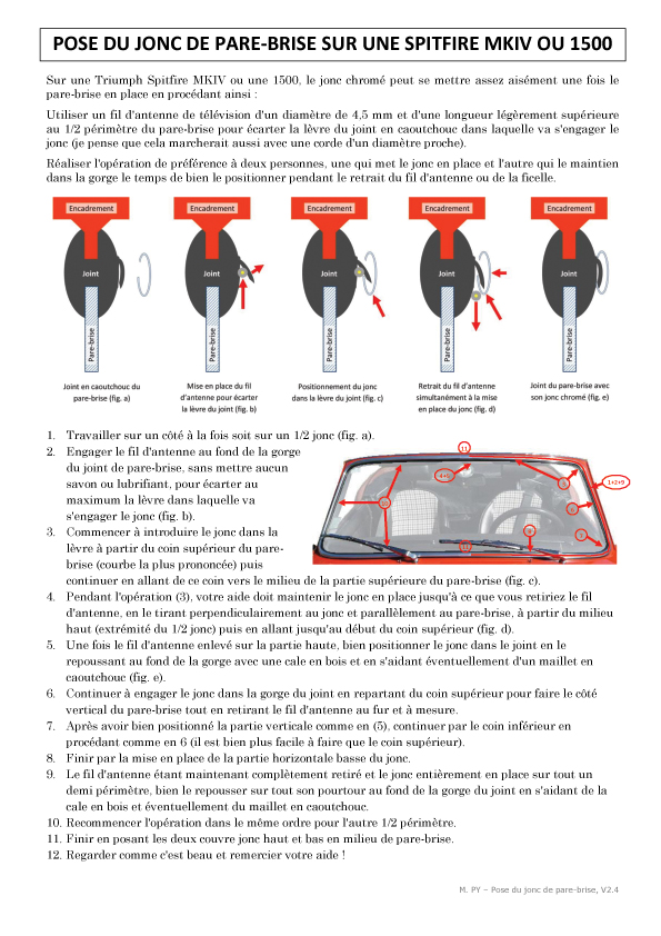 | (Le fichier "Pose jonc de pare-brise V2.5.pdf" est trop volumineux ou le nombre d'élement maximum est dépassé et n'a pas été enregistré) Bonjour, Merci Charly, ma méthode fonctionne parfaitement sur des joints récents, c'est cependant plus difficile mais faisable lorsque le joint est ancien et qu'il a perdu de son élasticité. Bien amicalement |