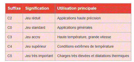 perso j'opte la classe C3 le tableau ci joint donne quelques info intéressantes * C2 : haute précision ; on n'y est quand même pas * C3 : avec un jeu raisonnable encaissera un débattement angulaire très léger ; La conception de l'ensemble depuis l'axe de sortie du boitier tournant en passant par le croisillon jusqu'au moyeu de roue en traçant le diagramme de charge et de contraintes on n'est pas dans une haute précision . Pour sen convaincre lire "Comprendre le jeu interne et les cages de roulement" |