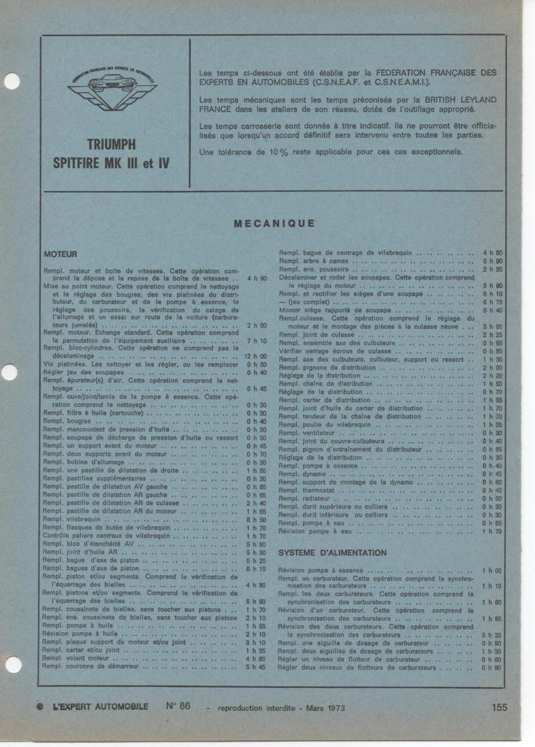 ![]() Je te joint le barème des temps de chez British Leyland !! Rien que pour le 1 er poste , il est donné 4h90, soit quasi 5 h !! Reste a trouver les 11 heures de différence . La réponse sera évidement qu il ne connait pas cette voiture, etc , etc : Ah mon brave monsieur , ces voitures anciennes !!!!! Quand a la facture , c est pareil : 0,50 pour le contrôle du véhicule ??? quel contrôle ??? Prise compression , ça peux le valoir ! Recalage carrosserie , également , pas toujours facile ! Calage de l allumage , 1/2 h, c est amplement suffisant. Recalage pollution, va avec le reglage carbu . Et puis travailler a 124,00 € de l heure , c est assez, voir très élevé !! A M H A , c est trop cher . D autres avis a suivre Cdlt j p c |