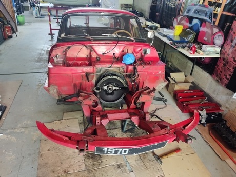Au départ de la restauration de ma GT6, je me suis retrouvé avec deux caisses, incomplète pour la seconde, 2 moteurs, 3 BV et encore beaucoup d’autre pièces en double ou triple afin d’en restaurer les meilleures pour ma restauration. Très vite a germé l’idée d’une possible restauration d’une deuxième GT6, mais ayant déjà une Spit et bientôt une GT6, il n’y avait guère d’intérêt et surtout ni le budget ni la place. Par contre je pensais qu’une GT6 pour tourner sur circuit ne devrait pas générer un budget très conséquent. En fait je me trompais quand même sur les économies à partir du moment où l’on se prend au jeu d’un peu de préparation. Du coup il ne me manquait que la place et encore pas mal de pièces.