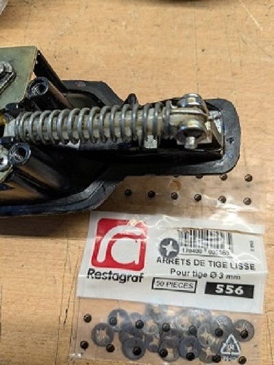 J'avais fait paraitre, à une certaine époque, sur le bulletin la réparation de la serrure. Cette réparation a fonctionné mais voici que la goupille mécanindus s'est fait la valise . La goupille qui assure la liaison entre la poignée et le levier en plastique (introuvable mais réalisable en 3D. Bref , j'ai donc coupée une pointe de Dia 3.5 mm + 1 rondelle élastique pour résoudre le problème rencontré.