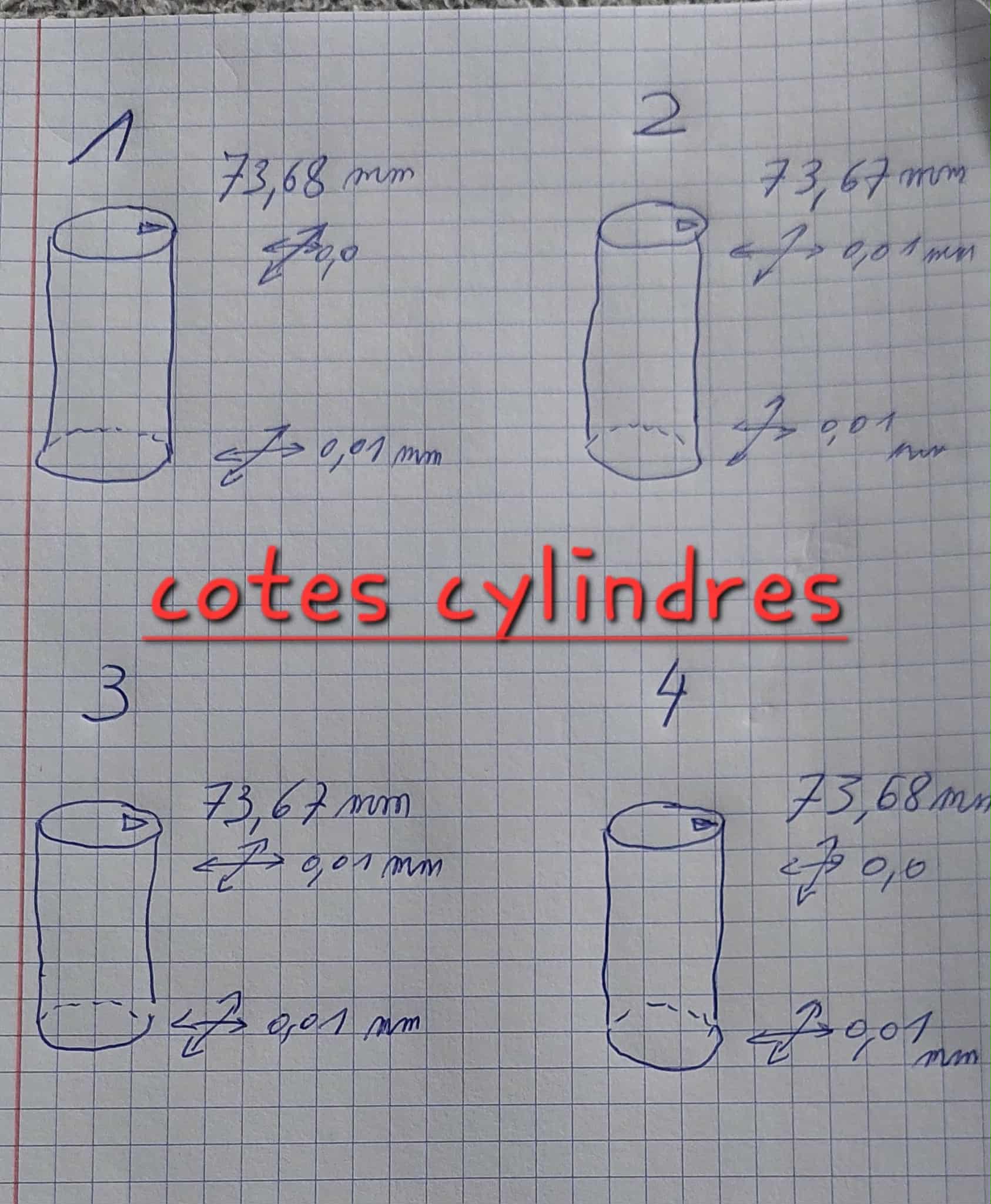 bonjour Tommy, pour les cylindres j'ai pris la mesure en fait à plusieurs hauteur de ceux-ci, ils me paraissent très réguliers, sur le haut des cylindres on voit la zone que les segments n'atteignent pas, mais je ne sens pas de différence avec le reste du cylindre, c'est plus encrassé que marqué.