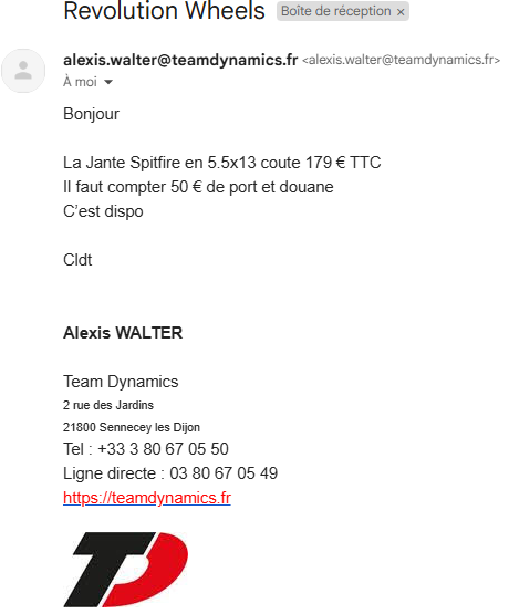 | Bonsoir Tommy, C'est drole c'est la ou j'ai envoyé un email hier soir, et ils m'ont répondu mais par l'intermédiaire de TEAM DYNAMICS à Dijon, tu connais ? ( à priori elles sont dispo ) http://teamdynamics.fr/ ( tu completes ta demande sur révolution wheels et la réponse arrive de Team Dynamics ) |