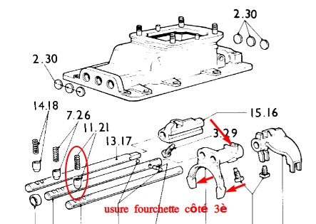 Ensuite un souci sur le couvercle supérieur de boîte avec le verrouillage de l'axe de sélection est possible mais peu fréquent (pion/ressort) et la 4è serait en partie affectée.