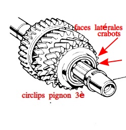 Après déplacement du synchro sur l'arbre, vérifier que le circlips du pignon de 3è n'a pas sauté. À remplacer obligatoirement par un neuf si c'est le cas (ne sert qu'1 fois!). Utiliser 3 longs tournevis fins pour la dépose (un poil galère:/).