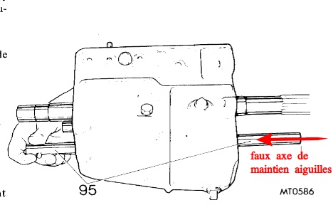 Celui-ci implique la dépose de la cloche et du carter Ar (après sortie du pignon renvoi de compteur) + fabrication d'un faux axe de train fixe en bois, tube métal ou plein, avec chanfrein d'entrée permettant de retenir les aiguilles en place lors de la poussée/dépose de l'axe vers l'AR.