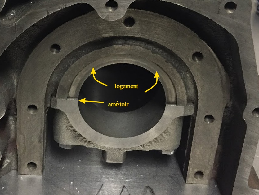 Au remontage il faudra respecter le sens du palier càd : l'encoche de coussinet côté bloc et celle côté chapeau doivent se trouver toutes les 2 près d'une seule des 2 vis.