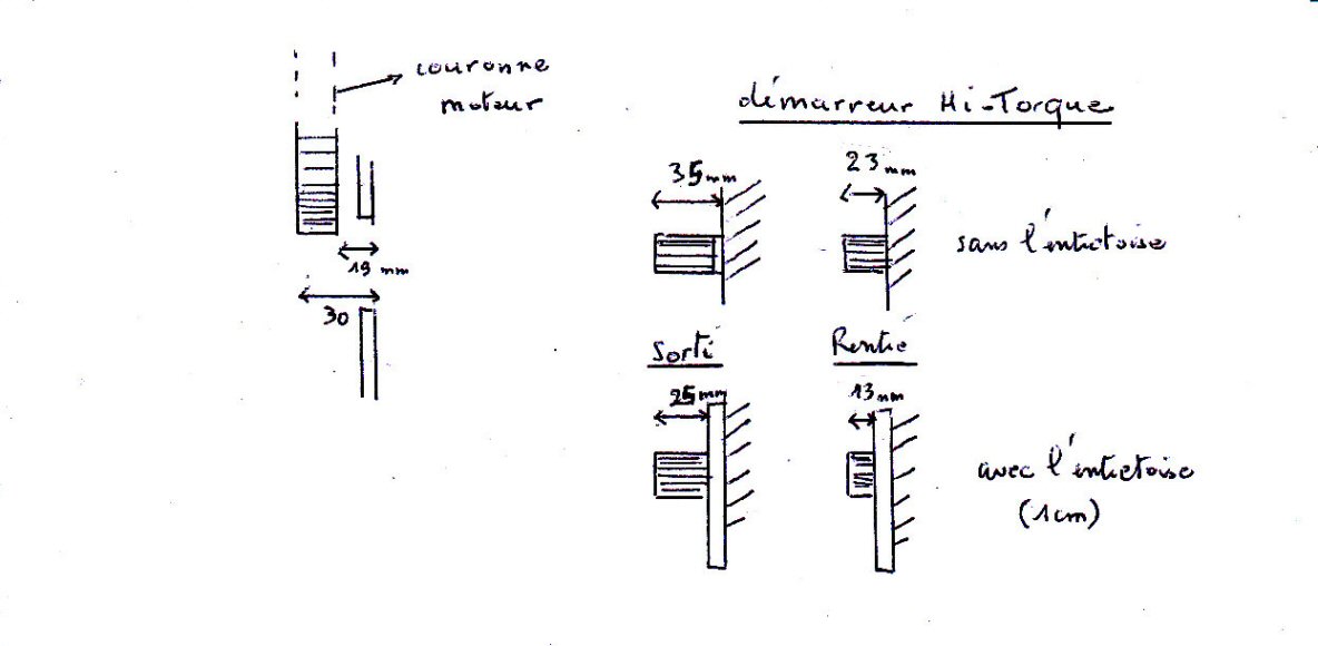 Merci beaucoup pour ce retour! J'ai envie de me faire confiance et de tester en effet avec l'entretoise d'origine. J'ai mesuré et je trouve 1 mm de marge entre le volant moteur et le pignon en position de repos. Au final ma conclusion est qu'il me faudrait presque reculer le démarreur en ajoutant une cale de 2mm pour éloigner le pignon du volant moteur. Mais je vais vérifier à 2 fois car ma conclusion est à l'inverse de toutes vos remarques