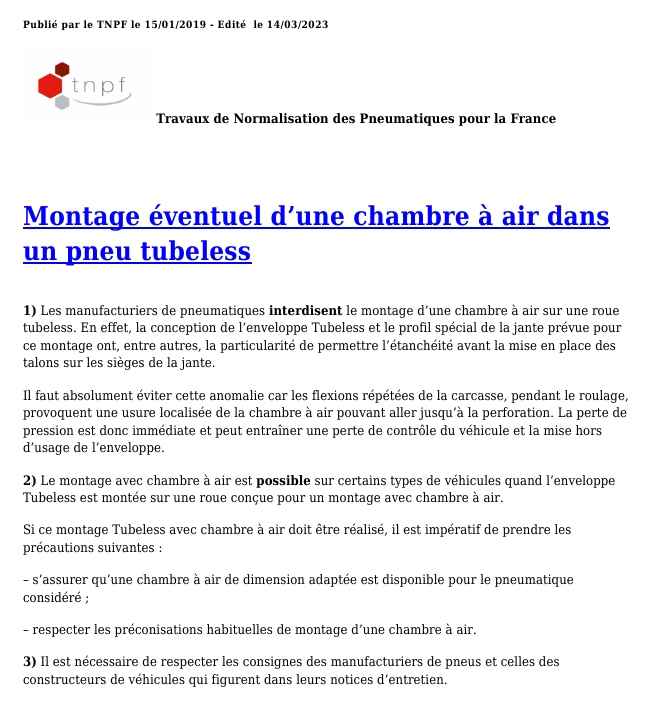 ![]() Il va te falloir déposer les pneus pour voir le profil de la jante !! Ton mécano devrait pouvoir te confirmer si les jantes sont tubless ou pas. Également , le trou pour la valve est PLUS GRAND pour le type tubtype ( avec chambre ) que le tubless. Par contre il est possible de monter des chambres avec des pneus tubless uniquement en 145 X 13 !! Voir copie de l article joint . Cdlt j p c |