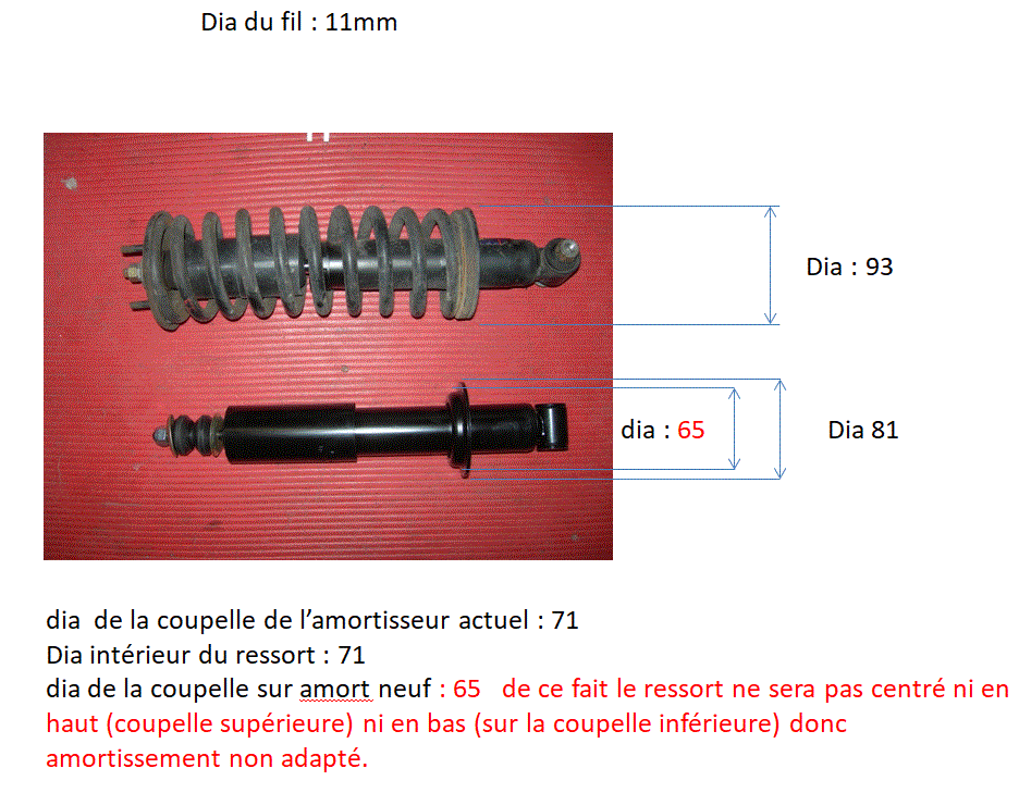 Vérifier particulièrement le diamètre extérieur de la coupelle d'assise du ressort par rapport au diamètre extérieur du ressort (sans doute des reproduction non conforme )