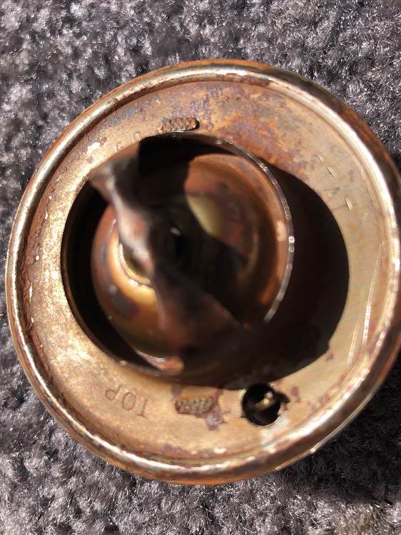 Démontage des tuyaux de refroidissement; du radiateur, du ventilateur; de la pompe à eau; alternateur; courroie; carburateurs; tubulure d'échappement; pipe d'admission; cache-culbuteurs; rampes de culbuteurs et culasse ainsi que les pièces attenantes (admission essence etc...). L'ancien thermostat étant un peu bas en température, j'en profite pour y mettre un 82°C neuf.