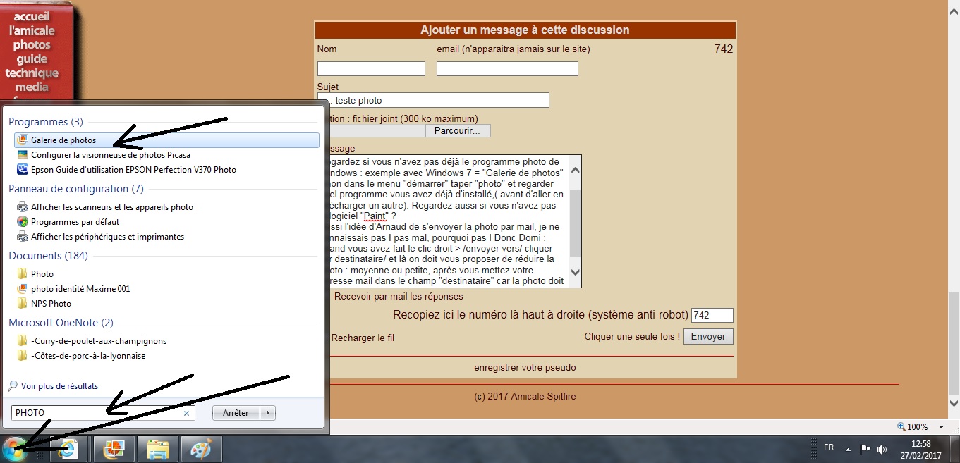 Aussi l'idée d'Arnaud de s'envoyer la photo par mail, je ne connaissais pas ! pas mal, pourquoi pas ! Donc Domi : quand vous avez fait le clic droit > /envoyer vers/ cliquer sur destinataire/ et là on doit vous proposer de réduire la photo : moyenne ou petite, après vous cliquez sur "joindre" et mettez votre adresse mail dans le champ "destinataire" quand votre fenêtre de messagerie s'ouvre (ça peut prendre quelques secondes) puis "envoyer". Est ce que ça va vous aider tout ça ??