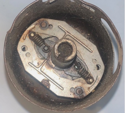 Dessous le mécanisme d'avance centrifuge de l'allumeur Delco ressemble à ceci (photo).