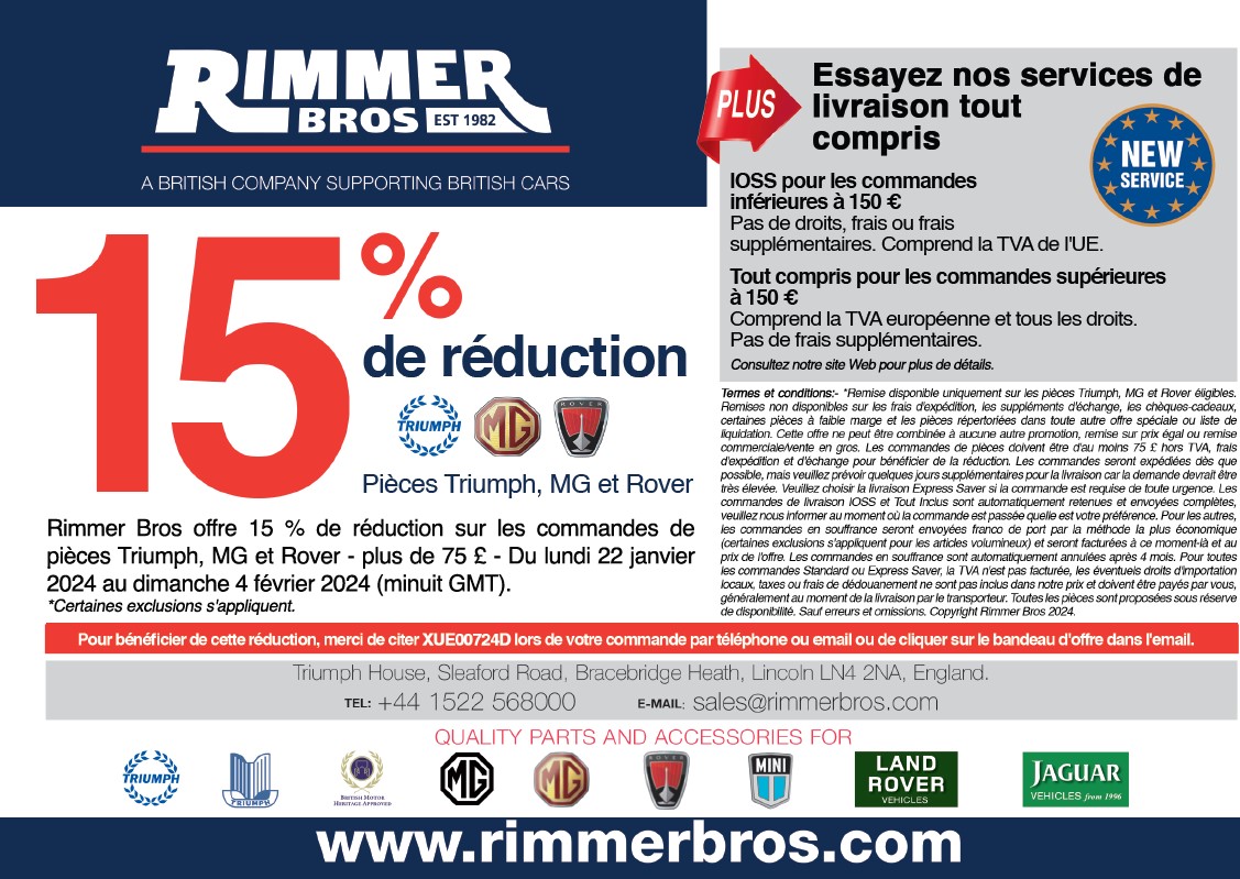 ![]() Nous avons été informés que RIMMER sera présent à RETROMOBILE Hall 3 stand G053. A cette occasion ils mettent en place pour les clients français une promotion . Le code promo pour les commandes en ligne est XUE00724D Pour ceux qui voudraient en profiter ! Bon salon ! |
