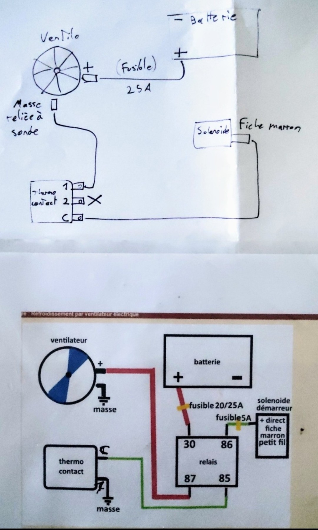 ![]() Sur le forum j'ai vu un schéma plus bas que le mien, j'ai essayé de le brancher comme ça mais étant très moyen en électricité auto, je n'ai pas su le faire , par contre j'ai quand même réussi à le faire fonctionner comme mon schéma au haut. Ouf Le problème c'est quand le ventilateur se déclenche à une température donnée, impossible de couper le contact tu moteur. Je peux même enlever la clé du Neiman et le moteur tourne toujours. Je n' ai que la solution de réduire la température du déclanchement du moteur pour l'éteindre pour couper le moteur. Pour info j'ai mis une sonde réglable dans la durite avec un interrupteur rotatif. Si vous avez une idée pour améliorer mon installation. Merci beaucoup |
