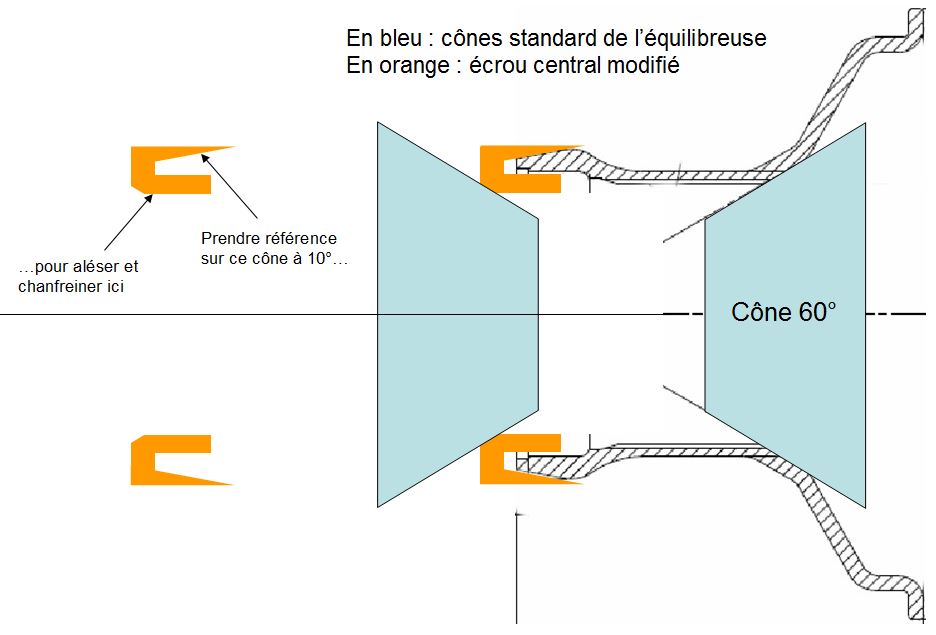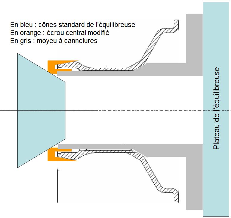 Futur propriétaire d'une Spitfire Mk2 (en cours d'acquisition), je souhaite l'équiper de roues fil et je m'interroge comme beaucoup d'entre vous sur leur équilibrage. J'ai parcouru les sujets du forum et la documentation MWS, et j'ai bien compris la problématique de montage sur équilibreuse. Pour autant je n'ai pas trop envie de parcourir toute la France à la recherche de l'oiseau rare, ni faire appel à un spécialiste abonné aux tarifs "prestige" genre Jaguar ou Aston Martin. Plusieurs d'entre vous une évoqué la possibilité d'utiliser un écrou central tourné pour transférer l'axe du cône externe de la roue vers un cône mâle standard de l'équilibreuse. En pièce jointe deux possibilités déjà évoquées dans certains fils ici, telles que je les ai comprises (soyez indulgents, ce sont des schémas de principe, pas des plans de réalisation...) - Prise entre 2 cônes d'équilibreuse, l'écrou central modifié jouant le rôle de transfert vers le cône externe de la roue (usinage précis nécessaire) - Montage de la roue sur un moyeu cannelé, serrage avec l'écrou modifié puis montage sur l'équilibreuse entre plan et cône, en s'assurant que le cône externe de l'équilibreuse n'interfère pas avec le moyeu. Quelqu'un a-t-il déjà expérimenté l'une ou l'autre méthode ? Des retours d'expérience ? La disponibilité d'un tel outillage permettrait de faire équilibrer ces roues à peu près partout. |