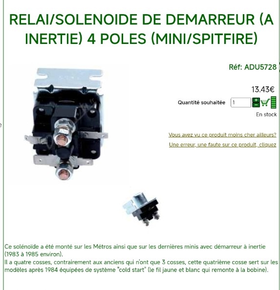 ![]() ![]() Tout mes meilleurs vœux pour cette nouvelle année . Ayant quelques petits soucis de démarrage parfois , j'ai décidé de changer mon solénoïde de démarrage. J'ai vu que sur ma spit 1500 1978 c'était une 4 bornes / cosses comme sur la photo . Visiblement la 4 cosse sert au "cold start " (fil jaune qui remonte à la bobine ) ? ? J'en profiterai également pour changer ma bobine si c'est nécessaire histoire de remettre tout en ordre. Ma question comment pourrais-je faire le branchement électrique version simplifiée pour mon affaire, avez vous un schéma, un croquis ( je suis assez limité en connaissance électrique, plus dans la mécanique) Jacques 74 |